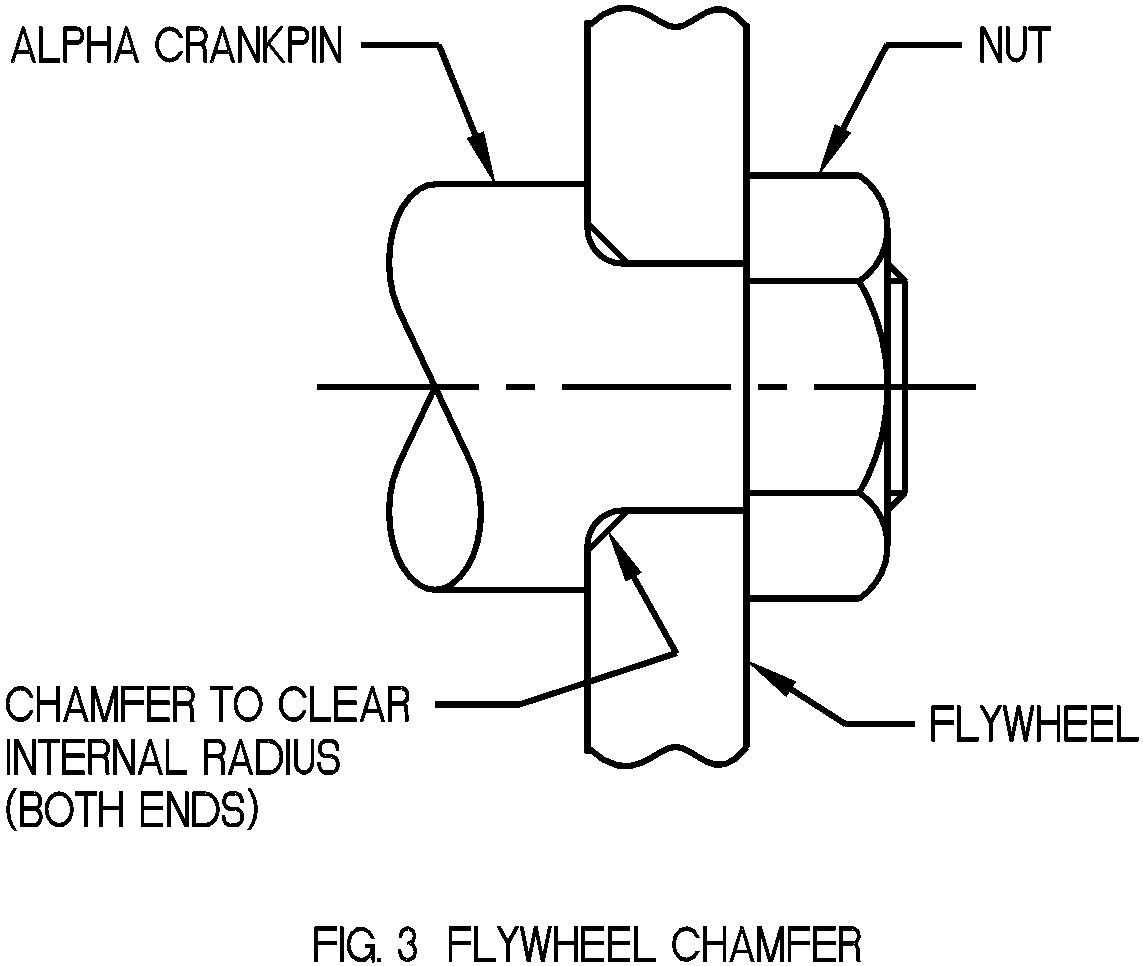 Overcoming the Problems: Crank Pin - When AMC designed the flywheel assembly there was no point in chamfering the holes through the flywheel into which the pins fit. The pin and the sleeve were cylindrical and tubular, in that order. When an Alpha crankpin is fitted it must have a radius on the internal corner therefore the flywheels should be chamfered to suit, otherwise pressing the flywheels on to the pin must surely damage the radiused shoulder and guarantee pin failure. The answer, ideally, would be to have Alpha undertake the work themselves - there seems to be no hint of failure of the pin in such circumstances. The chamfering is shown diagrammatically in Fig. 3.